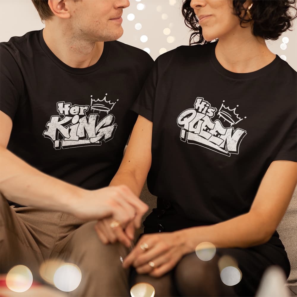 Αν ψάχνετε μπλουζάκια ζευγαριού, αυτό το σετ Her King & His Queen είναι η τέλεια επιλογή για να εκφράσετε το δέσιμό σας με στυλ, απλότητα και χαρακτήρα.