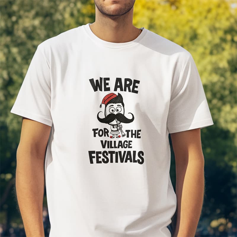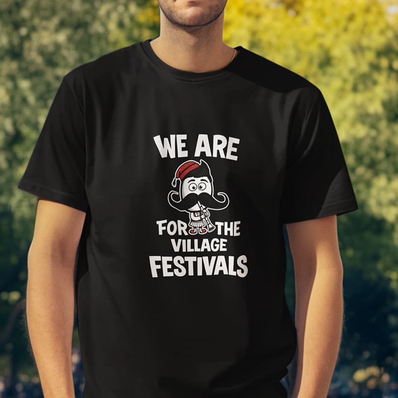 Το σχέδιο “We Are For The Village Festivals” συνδυάζει το σύγχρονο στυλ με την ελληνική παράδοση. Διαθέτει μια χιουμοριστική φιγούρα με πλούσιο μουστάκι, φέσι και κλαρίνο, αποτυπώνοντας την αυθεντική ατμόσφαιρα των ελληνικών πανηγυριών.